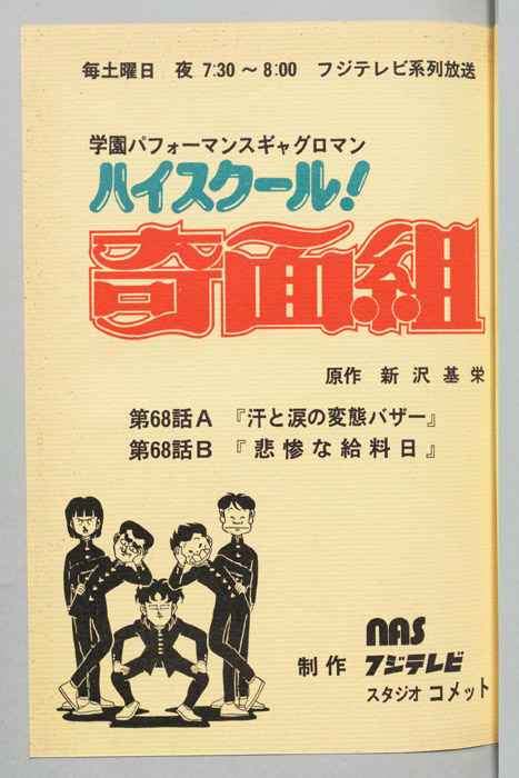 主な出演 : 葉繫,(冷越豪)玄田哲章,(大間仁)龍田直樹,(物星大)塩沢兼人,(出世潔)二又一成,(河川唯)高橋美紀,(宇留千絵)松井菜桜子,(伊狩増代)勝生真沙子,(若人蘭)柴田由美子,(事代作吾)田中秀幸,(真実一郎)島田敏,(二階胴)竹村拓『ハイスクール!奇面組』平凡な学校生活を送っていた女子中学生『河川唯(かわ ゆい)』と『宇留千絵(うる ちえ)』は、『奇面組』と呼ばれる悪名高い5人の男子学生と出会うことによって、退屈だった学生生活が一変する。奇面組のリーダー『一堂零(い