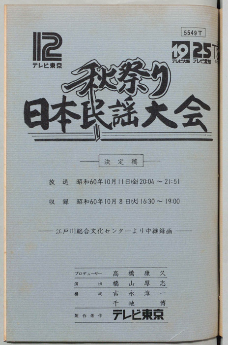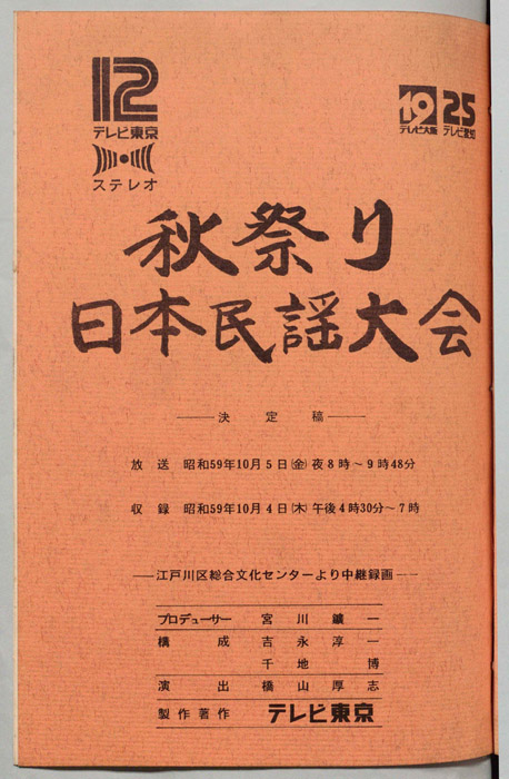 主な出演 : 大塚文雄,小野花子,金沢明子,小杉真貴子,後藤清子,津軽家すわ子,つくだ貞夫,成田武士,早坂光枝,原田直之,三浦隆子,(司会)伊東四朗,桑田靖子,(踊り)豊川ひさ子,おさな会,民族芸能文化連盟,民謡楽成田会,弘前石川流やまぶき会,(和