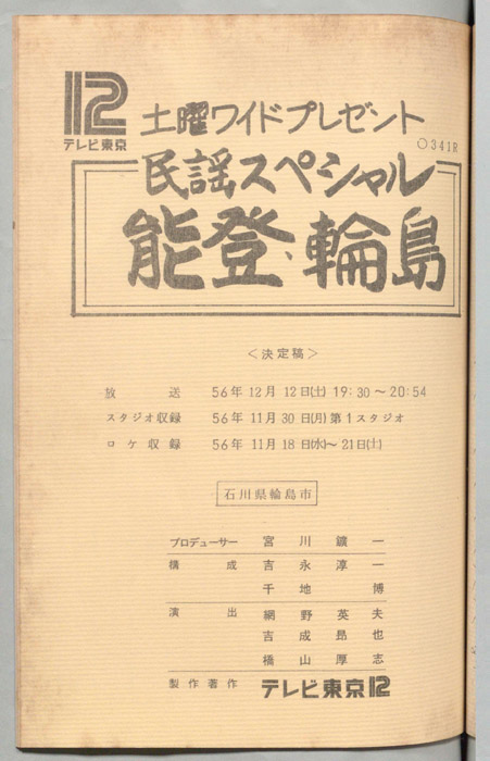 主な出演 : (司会)団しん也,(アシスタント)二階堂杏子,(唄)前浜信太郎,(太鼓)七尾豊年太鼓保存会,(踊り)七尾まだら保存会,大岩甚七,川端吉夫,(三味線)小川幸一,関正仁,(尺八)左川日出男,細田清,(音頭)高木仙十郎,(合唱)林一郎,国