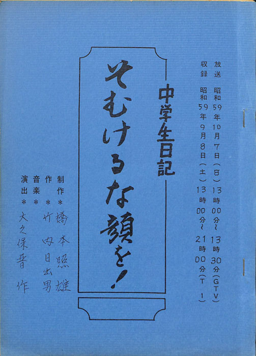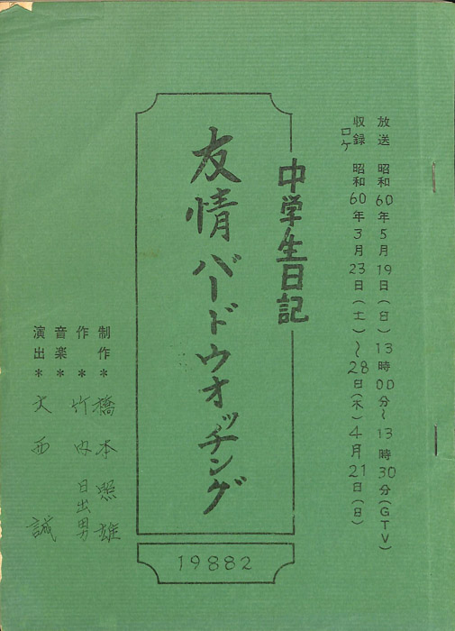 主な出演 : 大島篤,三輪深雪,熊沢尚人【中学生日記】 中学生日記は1972年から2012年3月まで長きに渡って放送された学園ドラマである。1962年4月から放送された「中学生次郎」という番組を前身とし、何度か番組名を変更しつつ本ドラマに至る。最