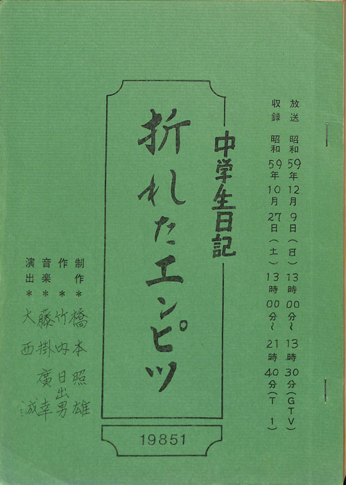 主な出演 : 熊沢尚人,黒坂進,松本麻紀【中学生日記】 中学生日記は1972年から2012年3月まで長きに渡って放送された学園ドラマである。1962年4月から放送された「中学生次郎」という番組を前身とし、何度か番組名を変更しつつ本ドラマに至る。最