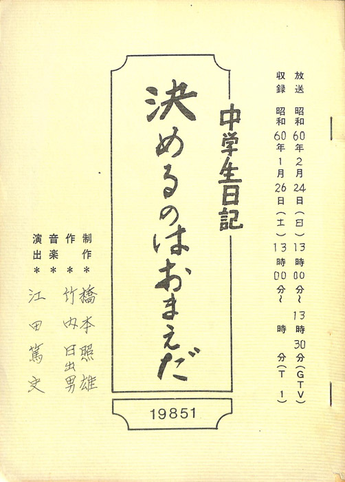 主な出演 : 荒川佳徳,田中徹,松本三紀子【中学生日記】 中学生日記は1972年から2012年3月まで長きに渡って放送された学園ドラマである。1962年4月から放送された「中学生次郎」という番組を前身とし、何度か番組名を変更しつつ本ドラマに至る。最