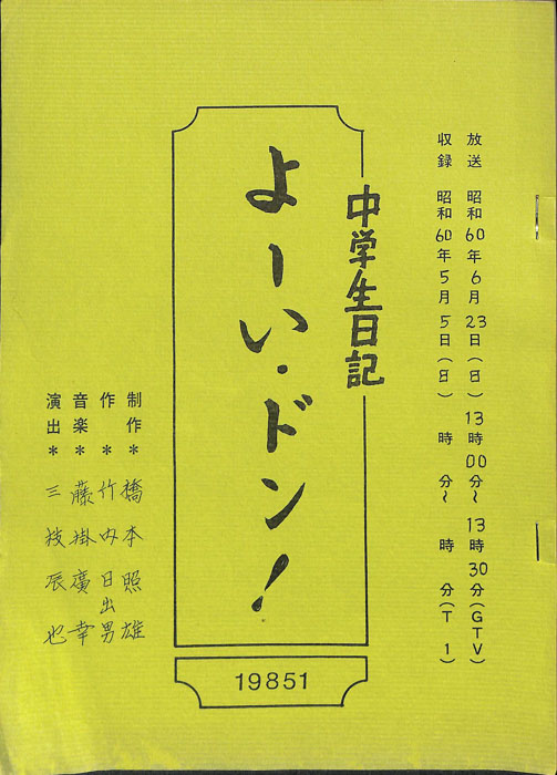 主な出演 : 東野英心,藤田康雄,藤城健太郎【中学生日記】 中学生日記は1972年から2012年3月まで長きに渡って放送された学園ドラマである。1962年4月から放送された「中学生次郎」という番組を前身とし、何度か番組名を変更しつつ本ドラマに至る。最