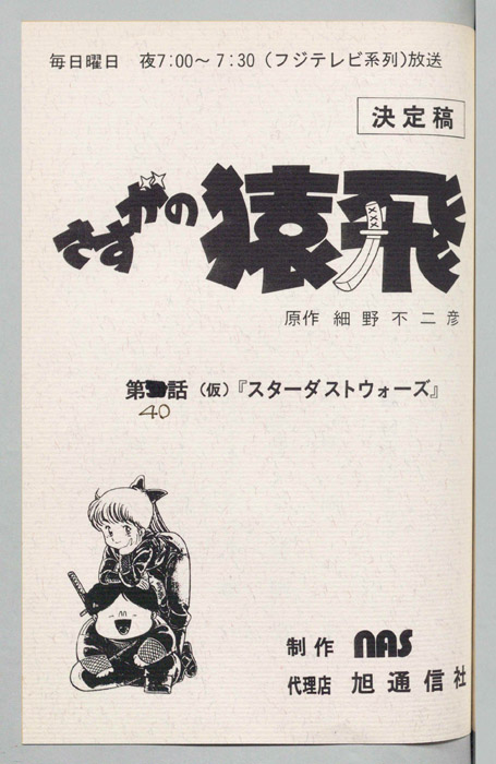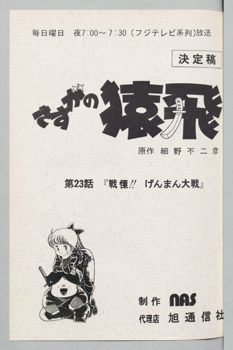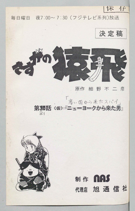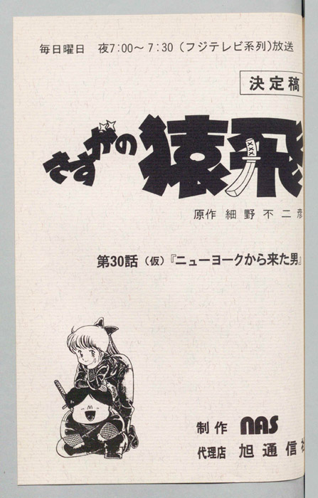 主な出演 : [プリンス肉丸(猿飛肉丸):三ツ矢雄二,猿飛かすみ:増山江威子,ヨーダ八宝斉(猿飛八宝斉):八奈見乗児,猿飛小源太:増岡弘,霧賀魔子:島津冴子,出門虎吉:寺田誠,緒形剣一郎:若本規昭,ダースト・シューター(霧賀太蔵):緒方賢一,00893『さすがの猿飛』忍者を育成して現代社会に送り出す教育機関『私立忍ノ者高校』は、表向きは平凡な私立高校として経営されている。忍ノ者高校の創設者の孫『猿飛 肉丸』は背が低く、丸々と太っていて、一見すると忍者とは思えない姿なのだが、忍