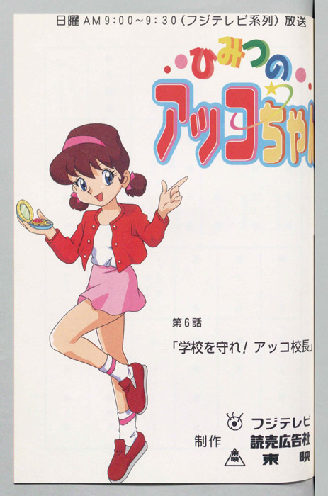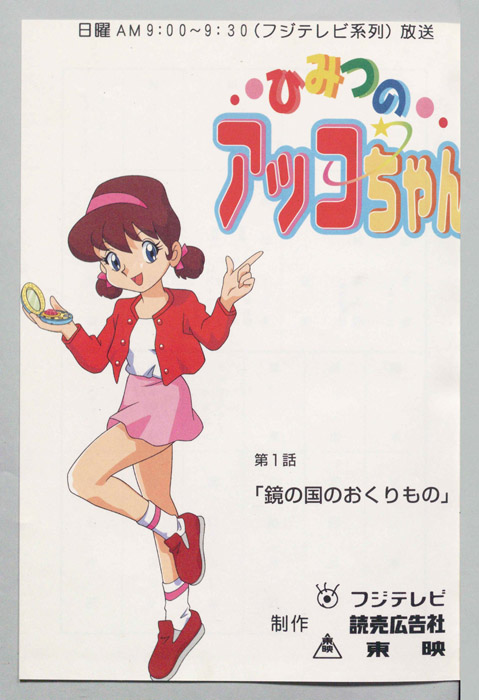 主な出演 : (アッコ)堀江美都子,(パパ)銀河万丈,(ママ)太田淑子,(モコ)杉山佳寿子,(大将)塩屋翼,(少将)三輪勝恵,(シッポナ)渡辺菜生子,(ドラ)佐藤正治,(タモツ)柳沢三千代,(マサ子)金丸日向子,(フジ子先生)冬馬由美,(ヨシ子先生)上【ひみつのアッコちゃん】加賀美あつ子は小学5年生の女の子。いつも大事に持っていた鏡を割ってしまい、庭に鏡のお墓を作って埋めた。その晩、鏡の妖精が現れ、今まで大切にしてくれたお礼にと、魔法のコンパクトをプレゼントする。そ