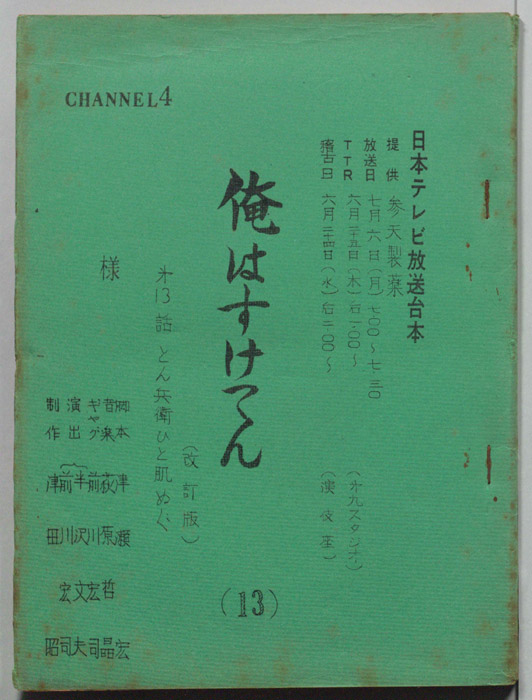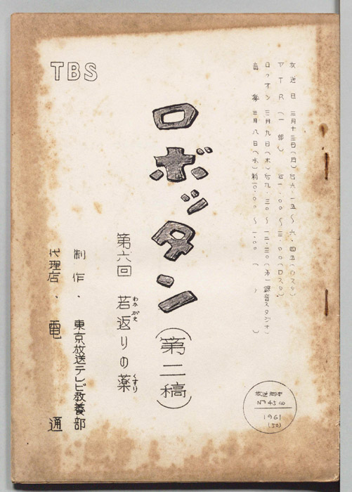 主な出演 : (全て手書き)飯塚俊太郎,森祐子,高樫寛,平井隆博,村井国夫,川地民夫,浜田寅彦,宮崎達也,武智杜代子,汐路彰,今井和子,花かおる,佐々木梨里- 作家 : 向田邦子