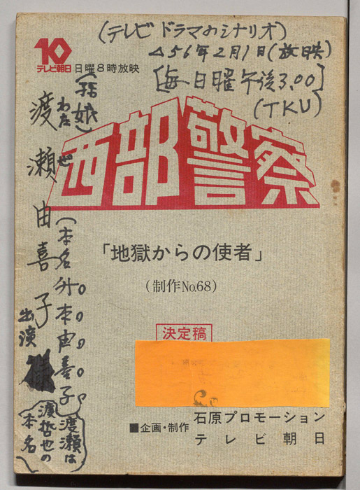主な出演 : 渡哲也,舘ひろし,神田正輝,谷川竜,加納みゆき,谷啓,鈴木瑞穂,(以下手書き)南原宏治,中田浩二,粟津號,志賀圭二郎,西条 優,中村銀次,速見領,村添豊徳,斉藤四郎,菊川予市,大島光幸,米沢浩,高市好行,グループ12騎会,クロキプロ- 作家 : 永原秀一