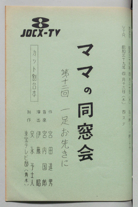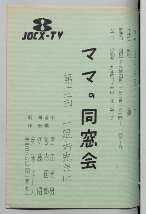 主な出演 : 浅茅しのぶ,田代百合子,中川弘子,菅佐原英一,上原謙,大関啓子,島崎雪子,沢村貞子,中村賀津雄,十朱久雄,永井達郎,水島光代,春日千里,大塚君代,水木涼子,三田冷子,沖妙子,柴世津子,御室蘭子,江間美都子,小林十九二,土紀就一,藤田貢,土- 作家 : 舟橋和郎