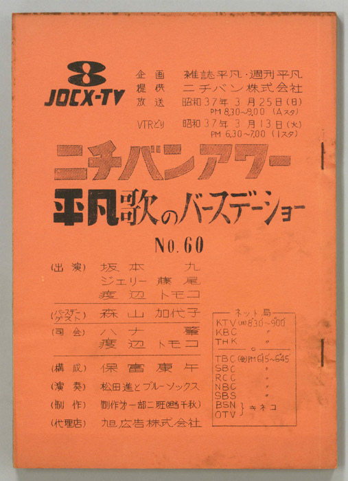 主な出演 : 坂本九,ジェリー藤尾,渡辺トモコ,九重祐三子,牧村ユカ,ダニー飯田とパラダイスキング,増田多夢,佐野修,上野保夫,石田知,ジョージ大塚,鈴木章治とリズムエース,志麻晴夫,富松千代志,バトン・トアラー,他マナセプロ総出演,ミスター珍,立川談志
