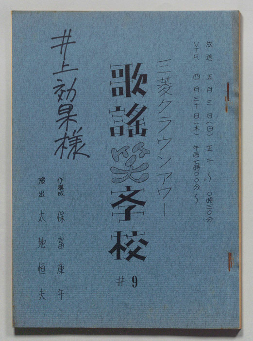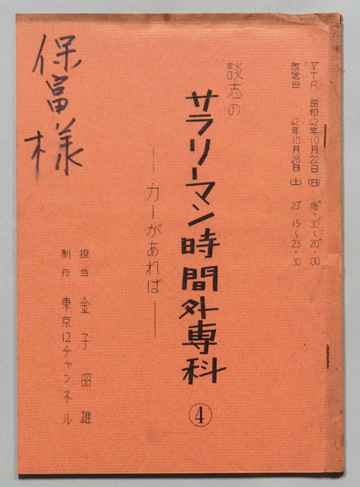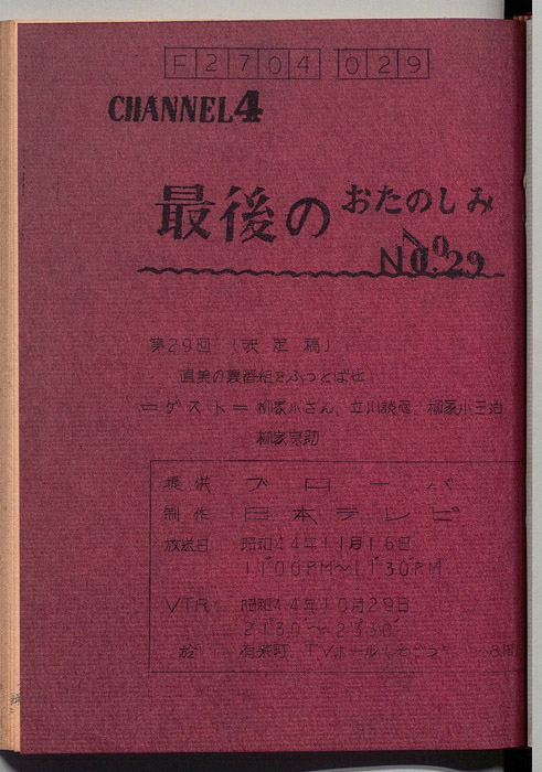 主な出演 : (司会)伊丹十三,高山ゆう子/立川談志,大竹省二,黒柳徹子,岡部冬彦,星野大五郎,青空ハルオ・アキオ- 作家 : 西野晧三