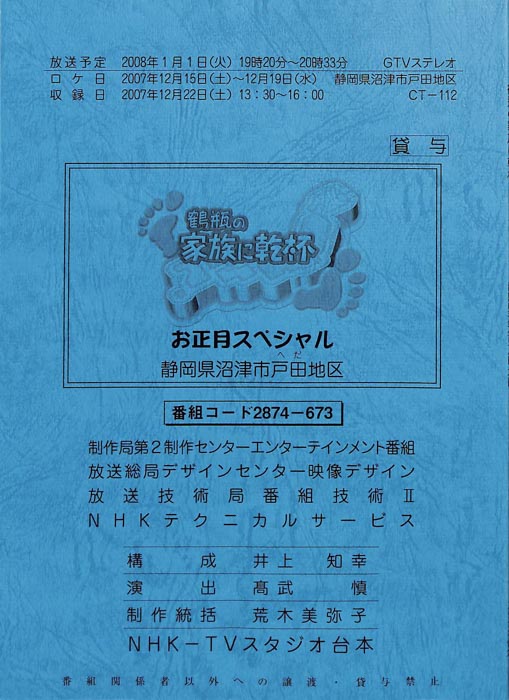主な出演 : 笑福亭鶴瓶,草彅剛,西村知美,乾貴美子,松尾雄治,(ナレーター)飯塚昭三,大森章督,マリリン山田- 作家 : 大竹研