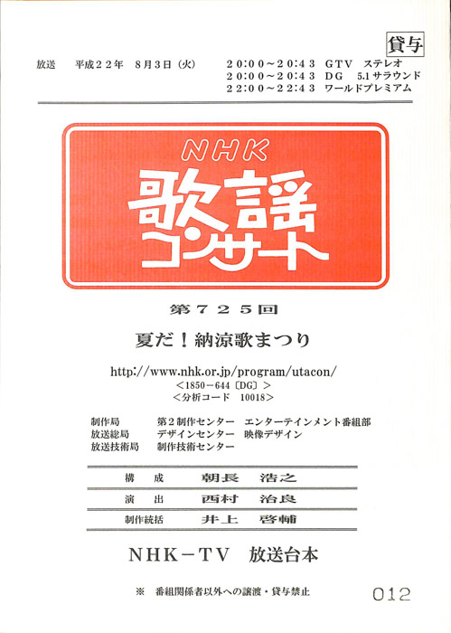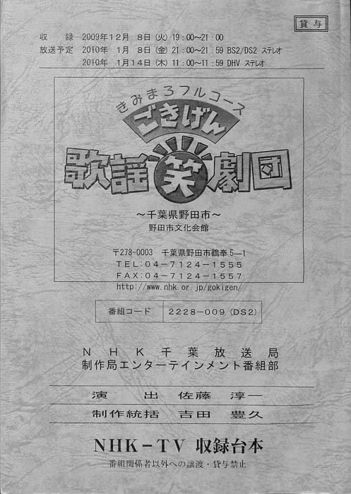 主な出演 : 綾小路きみまろ,早乙女太一,さかなクン,川中美幸,原口あきまさ,細川たかし,山本みゆき,今井靖彦,村岡弘之,玄也,ツー・ライス- 作家 : 鈴木康仁,倉田ひさし