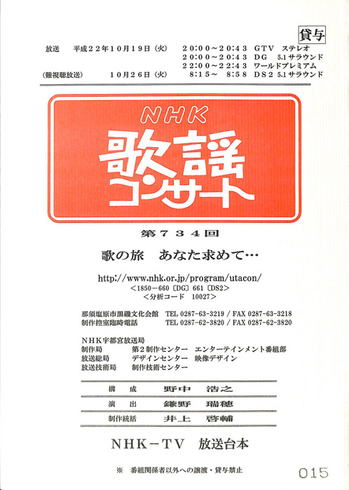主な出演 : 童よしみ,中村雅俊,長山洋子,野口五郎,細川たかし,水森かおり,三田明,三山ひろし,美輪明宏,森進一,山内惠介,由紀さおり・安田祥子,ロザンナ,太田幸司,綾小路きみまろ,西城秀樹,永野芽郁,松雪泰子,滝藤賢一,上村海成,三