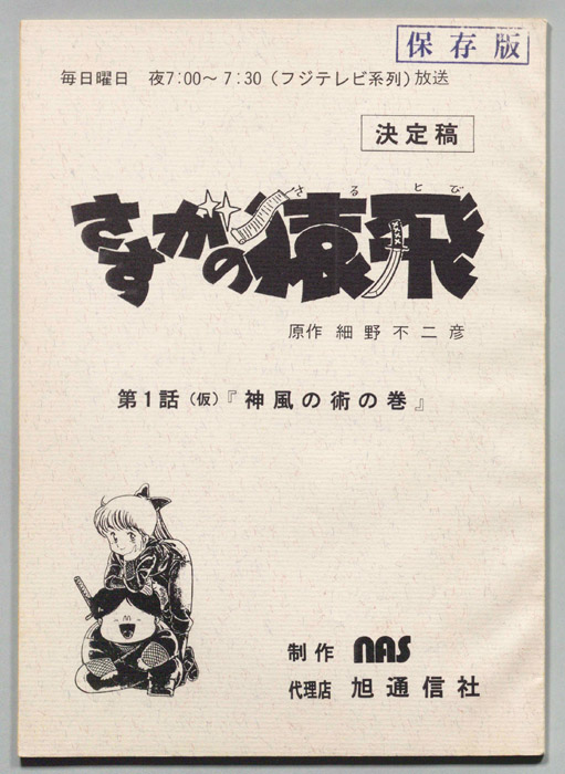 主な出演 : [猿飛肉丸:三ツ矢雄二,猿飛かすみ:増山江威子,猿飛八宝斉:八奈見乗児,猿飛小源太:増岡弘,霧賀魔子:島津冴子,出門虎吉:寺田誠,00893:千葉繫,004989:間嶋里美,忍豚:田中真弓]『さすがの猿飛』忍者を育成して現代社会に送り出す教育機関『私立忍ノ者高校』は、表向きは平凡な私立高校として経営されている。忍ノ者高校の創設者の孫『猿飛 肉丸』は背が低く、丸々と太っていて、一見すると忍者とは思えない姿なのだが、忍
