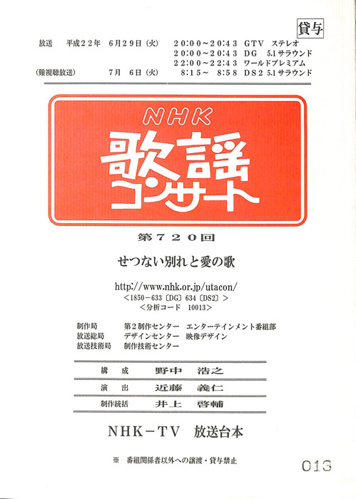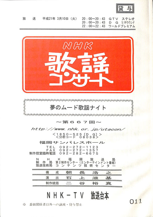 主な出演 : 五木ひろし,黒木姉妹,千昌夫,竹川美子,天童よしみ,西尾夕紀,二葉百合子,美川憲一,三山ひろし,由紀さおり,小田切千