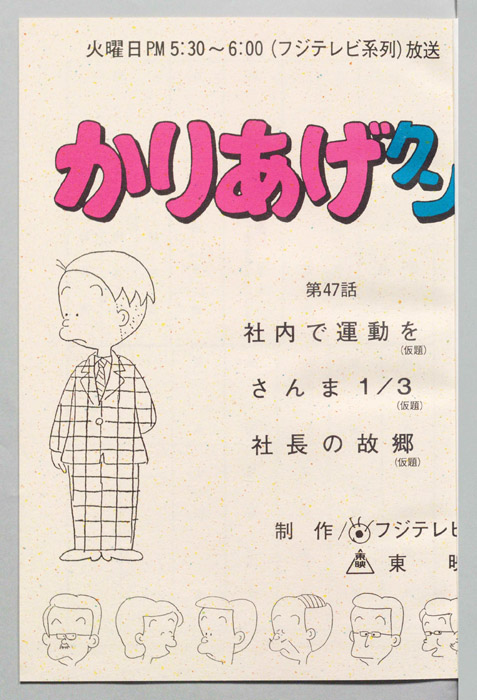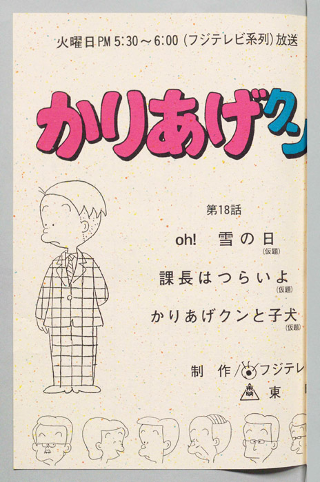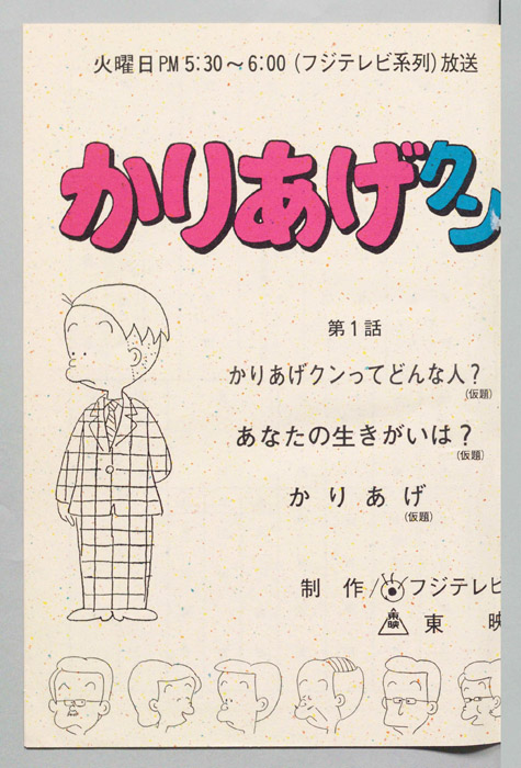 主な出演 : 藤)[堀川亮],(古川)[難波圭一],(もみあげ)[山田恭子],(うなぎ屋の親父),(ヒサエ)[渡辺菜生子],(太子)[江森浩子],(大家)[大竹宏],(おかっぱ)[萩森順子]/(かりあげ)[塩屋翼],(社長)[八奈見乗児],(課長)[野『かりあげクン』「ほんにゃら産業」の営業課に勤務し、刈り上げ頭が特徴的なサラリーマン「かりあげ正太」は、上司に媚びることを嫌い、人と同じ行動を取ることを好としない変わり者だった。しかし、イタズラをすることには天才的な能力を発揮する。正