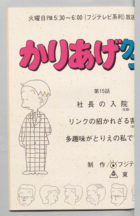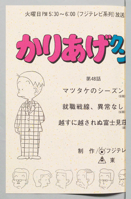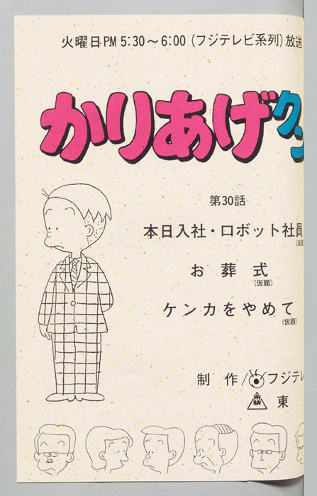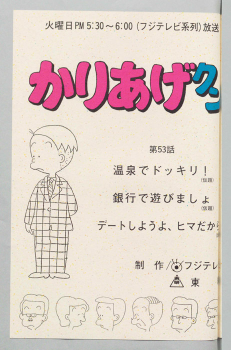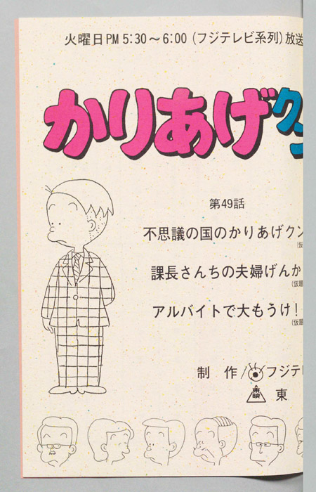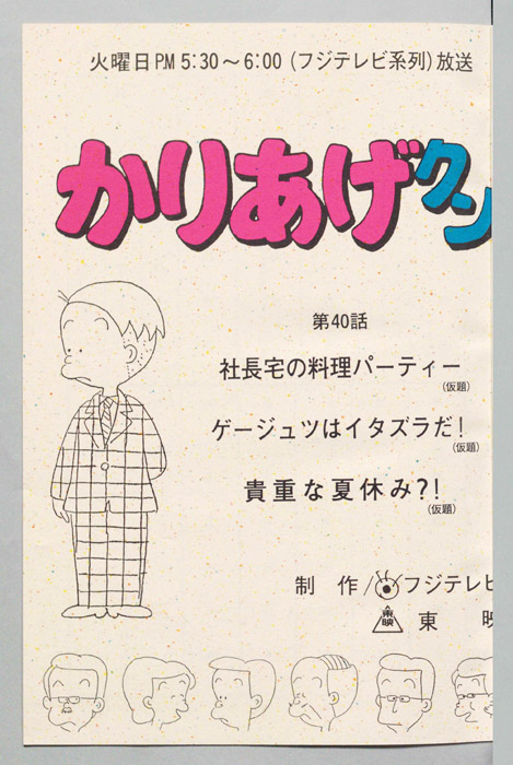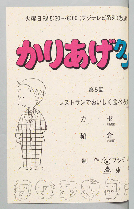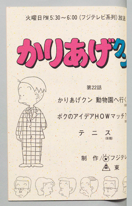 主な出演 : みあげ)[山田恭子],(おかっぱ)[萩森順子],(デパートの店員),(ヒサエの母親),(レスラー男),(リュウ),(そのマネージャー),(甘味処の女店員),(登山男)『かりあげクン』「ほんにゃら産業」の営業課に勤務し、刈り上げ頭が特徴的なサラリーマン「かりあげ正太」は、上司に媚びることを嫌い、人と同じ行動を取ることを好としない変わり者だった。しかし、イタズラをすることには天才的な能力を発揮する。正