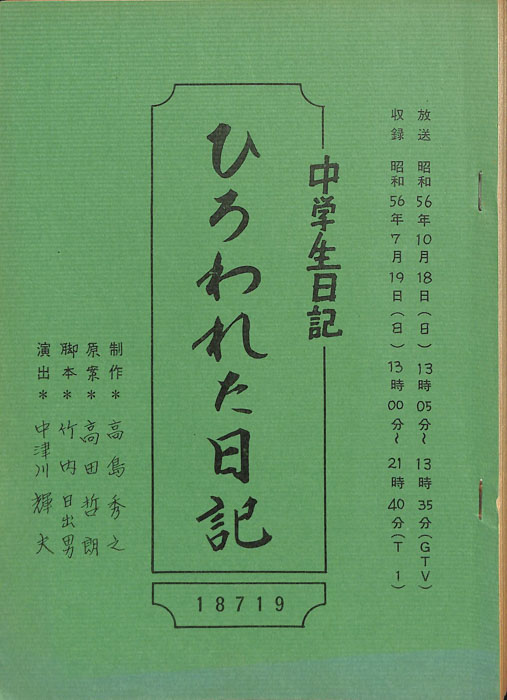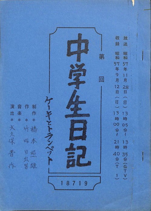 主な出演 : 本富士太,岡部雅郎,木崎裕次,藤田康雄,藤城健太郎,広瀬五朗,多田木亮佑,青井洋一郎,森孝子,松下昌子,杉本純子,久下香織子【中学生日記】 中学生日記は1972年から2012年3月まで長きに渡って放送された学園ドラマである。1962年4月から放送された「中学生次郎」という番組を前身とし、何度か番組名を変更しつつ本ドラマに至る。最