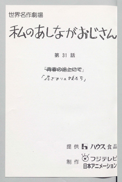 主な出演 : ジュディ・アボット:堀江美都子,ジュリア・ペンデルトン:天野由梨,サリー・マクブライト:佐藤智恵,ウォルター(ジャーヴィス・ペンデルトンの秘書):増岡弘【私のあしながおじさん】ジョングリア孤児院で育った13歳の「ジュディ・アボット」が孤児院を出る日が近づき、彼女は高校進学の援助を受けられる孤児を選ぶ選考会に臨むが、評議員たちを怒らせてしまう。落ち込むジュディだったが、自