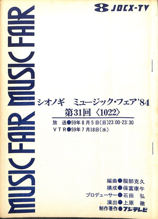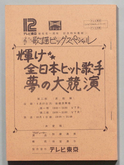 主な出演 : 五木ひろし,柏原芳恵,河合奈保子,小柳ルミ子,中森明菜,角川博,川中美幸,小林幸子,青木美保,小椋幸子,大里えり,岡田有希子,岡村有希子,荻野目洋子,加藤香子,岸浩太郎,吉川晃司,君津旭,沢木柳,神野美伽,滝里美,田中久美,辻沢杏子,成