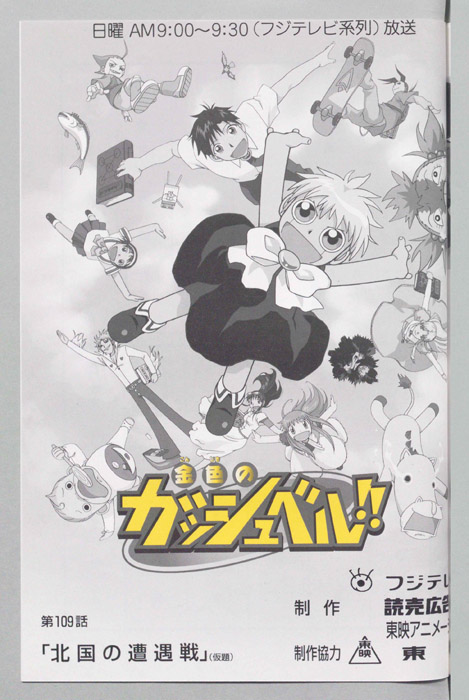 主な出演 : (ガッシュ・ベル)大谷育江,(高嶺清麿)桜井孝宏,(ウマゴン)こおろぎさとみ,(サンビーム)郷田ほづみ,(ティオ)釘宮理恵,(恵:台詞なし),(キャンチョメ)菊池正美,(フォルゴレ:台詞なし),(モモン)高橋直純,(エル)三石琴乃,(リ【金色のガッシュベル】 千年に一度行われる『魔界の王』を決める戦いに選ばれた百人の魔物の子供達、彼らは自身の内に秘めた力を引き出せる同じ心の形を持った人間のパートナーを探して、人間界で『魔本』の