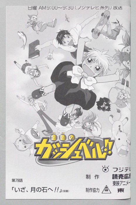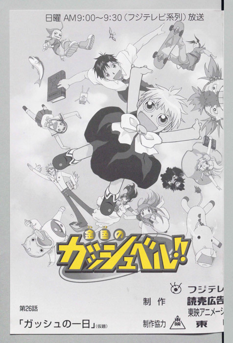 主な出演 : (ガッシュ・ベル)大谷育江,(高嶺清麿)桜井孝宏,(ウマゴン)こおろぎさとみ,(サンビーム)郷田ほづみ,(ティオ)釘宮理恵,(恵)前田愛,(キャンチョメ)菊池正美,(フォルゴレ:台詞なし),(モモン)高橋直純,(エル)三石琴乃,(リ【金色のガッシュベル】 千年に一度行われる『魔界の王』を決める戦いに選ばれた百人の魔物の子供達、彼らは自身の内に秘めた力を引き出せる同じ心の形を持った人間のパートナーを探して、人間界で『魔本』の