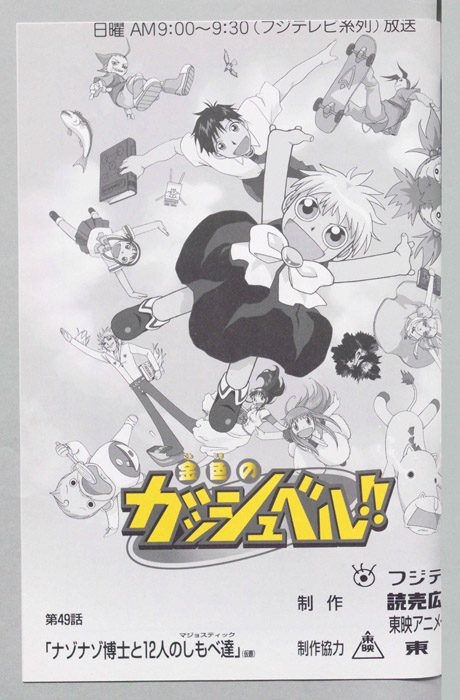 主な出演 : (ガッシュ)大谷育江,(清麿)桜井孝宏,(ウマゴン:台詞ナシ),(サンビーム:台詞ナシ),(キャンチョメ)菊池正美,(フォルゴレ)高橋広樹,(ナゾナゾ博士)納谷六朗,(キッド)岡村明美,(ベルギムEO)千葉繫,(ダリア)永野愛【金色のガッシュベル】 千年に一度行われる『魔界の王』を決める戦いに選ばれた百人の魔物の子供達、彼らは自身の内に秘めた力を引き出せる同じ心の形を持った人間のパートナーを探して、人間界で『魔本』の
