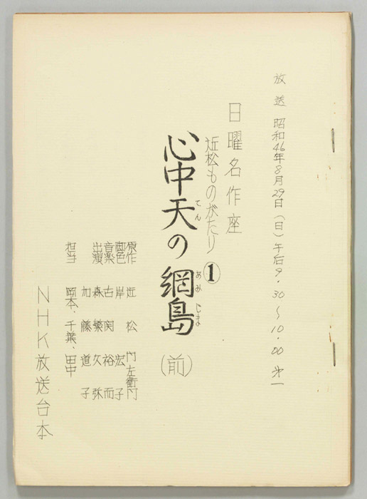 主な出演 : (手書き)/【第一幕】孝夫,左團次,玉三郎,今泉愛,松之助,當十郎,青虎,秀太郎,千次郎,孝二郎,小川正彦,国久,左升,翫之助,小美濃,進之介,松弥,玉雪,芝寿弥,玉基,秋之介,左太郎,秀寿,美喜造,若之介,阿部,島口,本田,鎌田,米- 作家 : 近松門左衛門