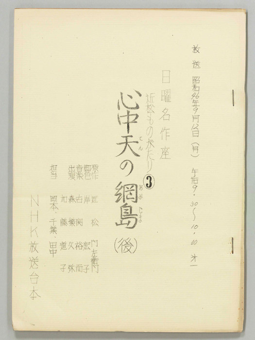 主な出演 : (手書き)染五郎,信三郎,孝太郎,葛谷梨花,幸太郎,松太郎,佳縁,高麗蔵,嶋之亟,富紀,小美濃,玉之助,又蔵,縁三郎,錦弥,幸次郎,山勢,岡崎,富志郎,富二朗,紫若,磐声,紀世助,錦吾,吉之丞,芳彦,山賀,信之,橘三郎,幸右東門,信- 作家 : 近松門左衛門