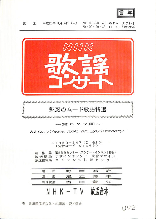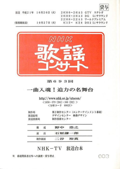 主な出演 : 石川さゆり,柏原芳恵,北川大介,小柳ルミ子,桜井くみ子,中村美律子,新妻聖子,新沼謙治,氷川きよし,ペギー葉山,小田切千