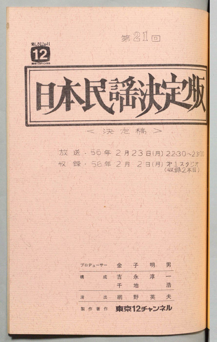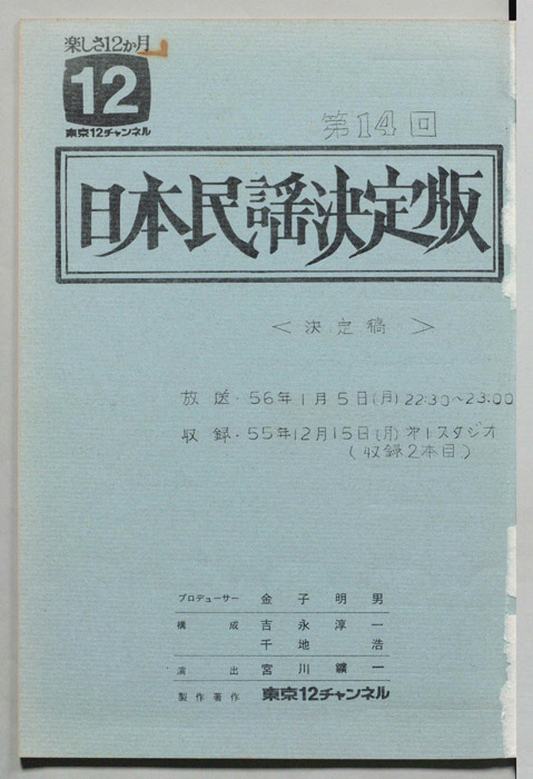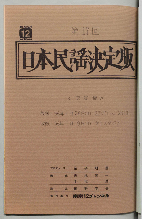 主な出演 : 金沢明子,佐藤寿昭,原田直之,早坂光枝,(司会)玉置宏,(伴奏)藤本琇丈社中<三味線>藤本秀輔,藤本秀三,<鳴物>山田鶴助,山田鶴志,<唄囃子>志村春美,秋野恵子,(尺八)米谷威和男,(津軽三味線)沢田勝秋,(太鼓)美波那る駒