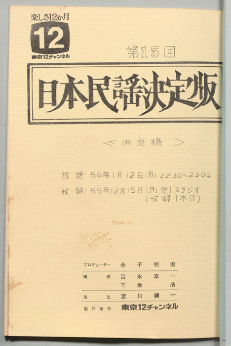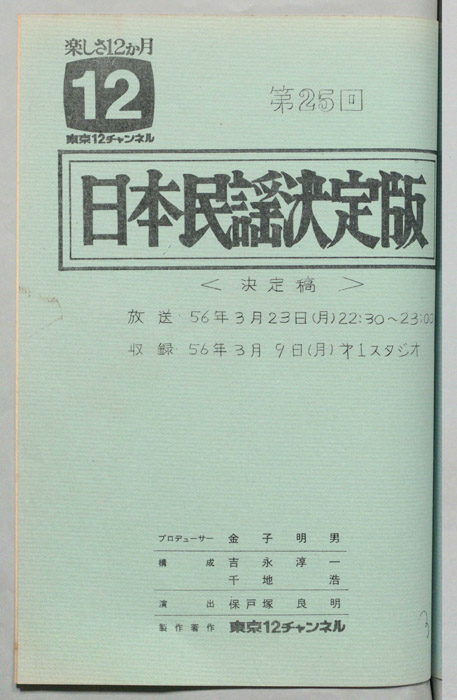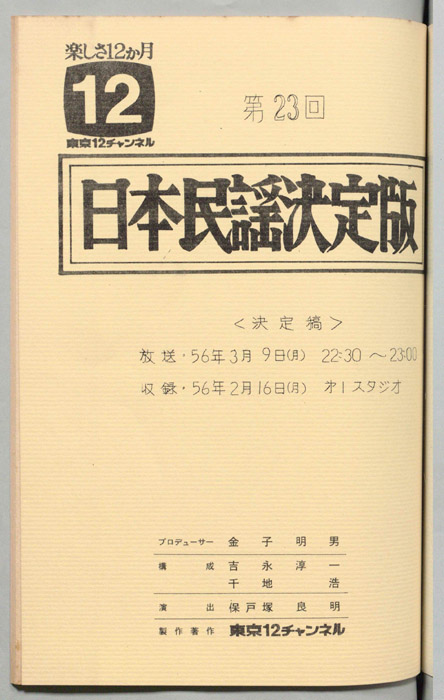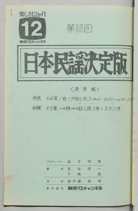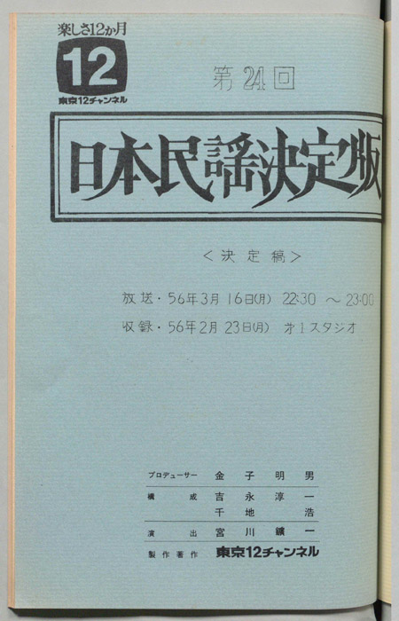 主な出演 : 金沢明子,高橋キヨ子,初代浜田喜一,吉沢浩,(司会)玉置宏,(踊り)花柳啓之社中,(伴奏)藤本琇丈社中<三味線>藤本秀輔,藤本秀三,<鳴物>山田鶴助,山田鶴志,<唄囃子>志村春美,秋野恵子,(尺八)米谷威和男,(津軽三味線)沢田勝秋,(太