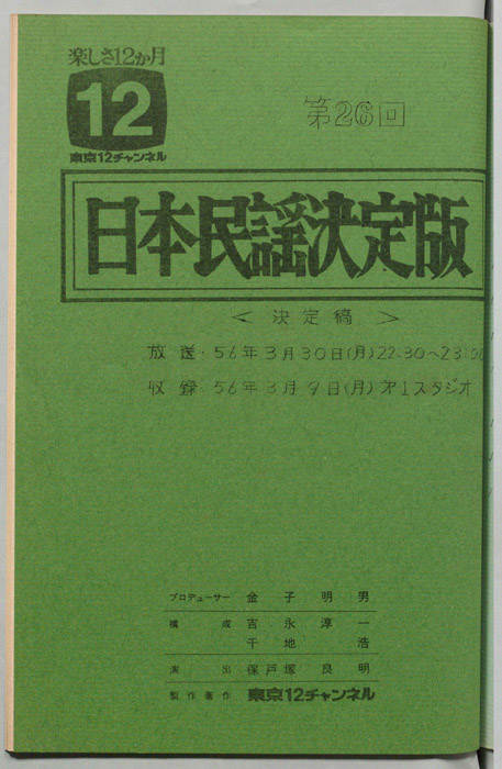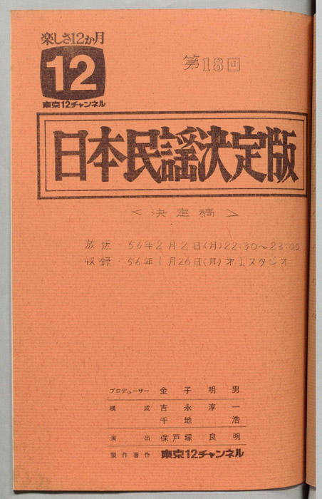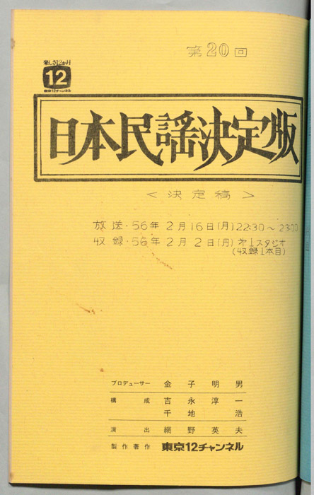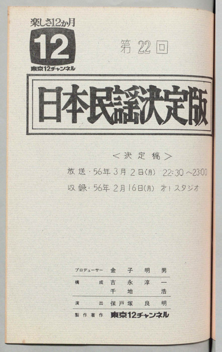 主な出演 : 金沢明子,佐藤松千恵,高橋キヨ子,浜田喜一,花柳糸之社中,(司会)玉置宏,(伴奏)藤本琇丈社中<三味線>藤本秀輔,藤本秀三,<鳴物>山田鶴助,山田鶴志,<唄囃子>志村春美,秋野恵子,(尺八)米谷威和男,(津軽三味線)工藤武,(太鼓)美波那る駒