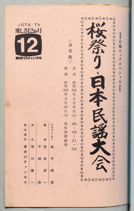 主な出演 : 大場いたる,金沢明子,鎌田英一,根本美紀,(司会)玉置宏,(踊り)西崎緑,菊島雅子社中,(伴奏)藤本琇丈社中<三味線>藤本秀輔,藤本秀三,藤本秀康,藤本秀茂,<鳴物>山田鶴助,山田鶴志,<唄囃子>志村春美,秋野恵子,(尺八)米