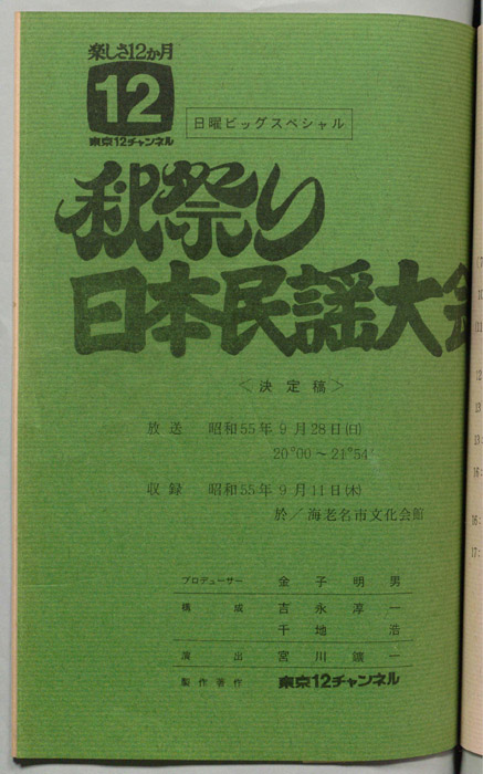 主な出演 : 金沢明子,岸千恵子,坂越達明,原田直之,(司会)玉置宏,(踊り)二代目・西崎緑,(伴奏)藤本琇丈社中<三味線>藤本秀輔,藤本秀三,藤本秀康,藤本秀茂,<鳴物>山田鶴助,山田鶴志,<唄囃子>志村春美,秋野恵子,(尺八)米谷威和男,(津
