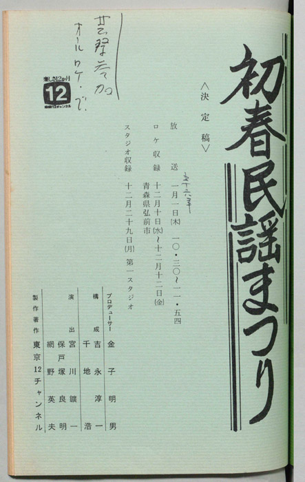 主な出演 : 浅利みき,江村貞一,小沢千月,金沢明子,岸千恵子,小杉真貴子,佐々木基晴,高橋キヨ子,初代・浜田喜一,山本謙司,小山貢社中,菊島雅子社中,菊の会,助六太鼓,津軽南部麻美社中,日景玲子社中,民族芸能文化連盟,(司会)玉置宏,(踊り)花