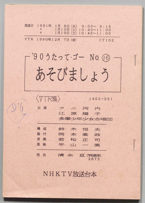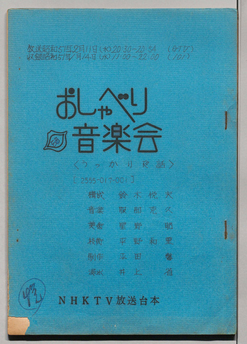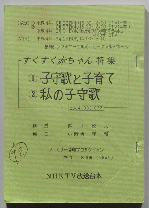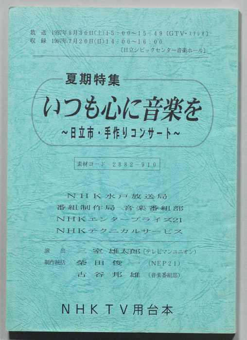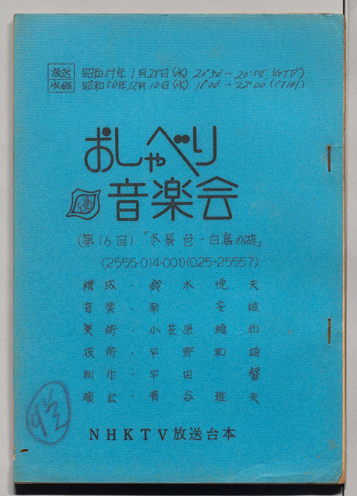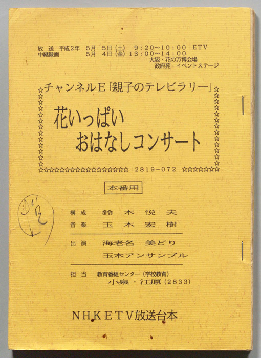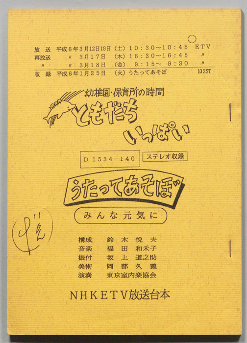 主な出演 : (司会)黒柳徹子,(司会・指揮)芥川也寸志,(歌)菅原洋一,(合唱)加古川市立神吉中学校コーラス部,(管弦楽)大坂フィルハーモニー交響楽団,(リズム)ザ・ハウムズ,(ピアノ)南安雄- 作家 : (構成)鈴木悦夫
