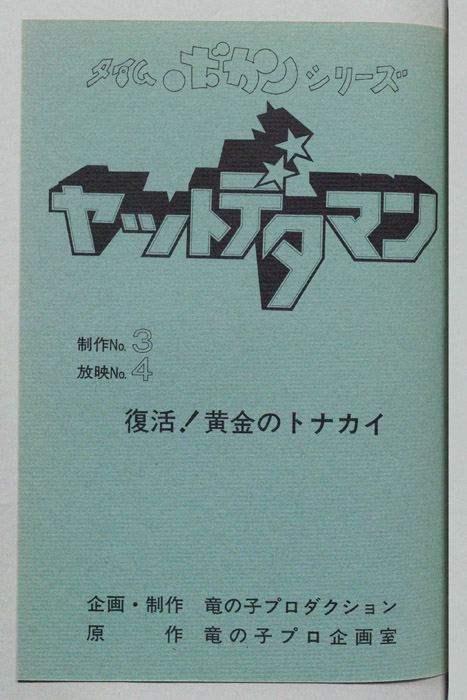 主な出演 : (時ワタル:ヤットデタマン)曽我部和行,(姫栗コヨミ:ワタルのパートナー)三浦雅子,(遠山金五郎:探偵長)阪脩,(カレン姫:ナンダーラ王国の姫)土井美加,(ダイゴロン:関取型ロボット)屋良有作,(ヒレン姫:スカプラ王朝の末裔)小【ヤットデタマン】 私立探偵事務所で助手として働くワタルとコヨミの元に1000年の未来から二人の遠い子孫である『カレン姫』がタイムマシンでやってくる。タイムトラベルの目的は時空を飛び越えることができる伝説の『ジュジャク』と