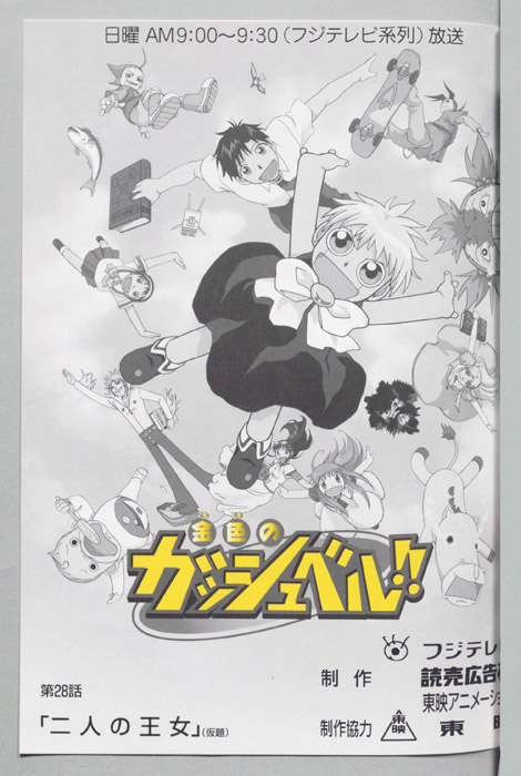 主な出演 : (ガッシュ・ベル)大谷育江,(高嶺清麿)桜井孝宏,(水野鈴芽)秋谷智子,(高嶺華)山﨑和佳奈,(高嶺清太郎)置鮎龍太郎,(金山)高木渉,(数学教師)上別府仁資,(生徒達),(窪塚泳太)神谷浩史,(ハイド)浦和めぐみ,(シェリー)折【金色のガッシュベル】 千年に一度行われる『魔界の王』を決める戦いに選ばれた百人の魔物の子供達、彼らは自身の内に秘めた力を引き出せる同じ心の形を持った人間のパートナーを探して、人間界で『魔本』の