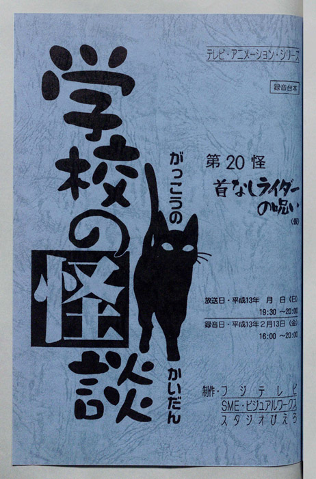 主な出演 : (宮ノ下さつき)川上とも子,(宮ノ下敬一郎)間宮くるみ,(青山ハジメ)本田貴子,(柿ノ木レオ)津村まこと,(恋ヶ窪桃子)佐久間紅美,(カーヤ/天の邪鬼)中尾隆聖,(坂田先生)青山穰,(首なしライダー)高木渉,(マキ・看護婦)夏【学校の怪談】 昔、母を亡くして父親と共に引っ越してきた姉弟の「宮ノ下さつき」と「宮ノ下敬一郎」新たな生活を始める。幼い頃の両親も通った『天の川小学校』の転入。初日に宮ノ下家の飼い猫の「カーヤ」が、旧校舎に入り込んでしまい、連