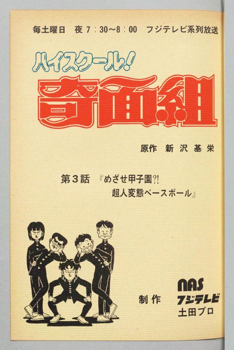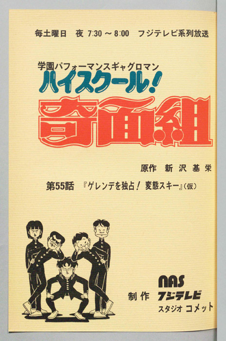 主な出演 : (一堂零)千葉繫,(冷越豪)玄田哲章,(大間仁)龍田直樹,(出瀬潔)二又一成,(物星大)塩沢兼人,(河川唯)高橋美紀,(宇留千絵)松井菜桜子,(祖父:善院清烈)青野武,(祖母)鈴木れい子,(善院秀吾)/(一堂零)千葉繫,(冷越豪)玄『ハイスクール!奇面組』平凡な学校生活を送っていた女子中学生『河川唯(かわ ゆい)』と『宇留千絵(うる ちえ)』は、『奇面組』と呼ばれる悪名高い5人の男子学生と出会うことによって、退屈だった学生生活が一変する。奇面組のリーダー『一堂零(い