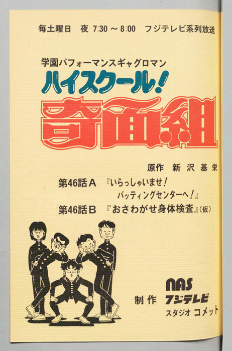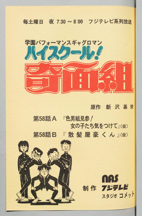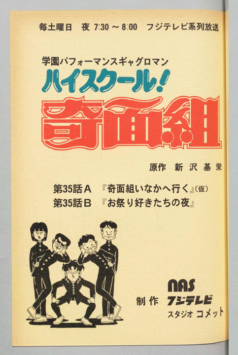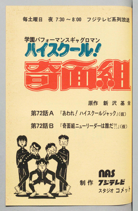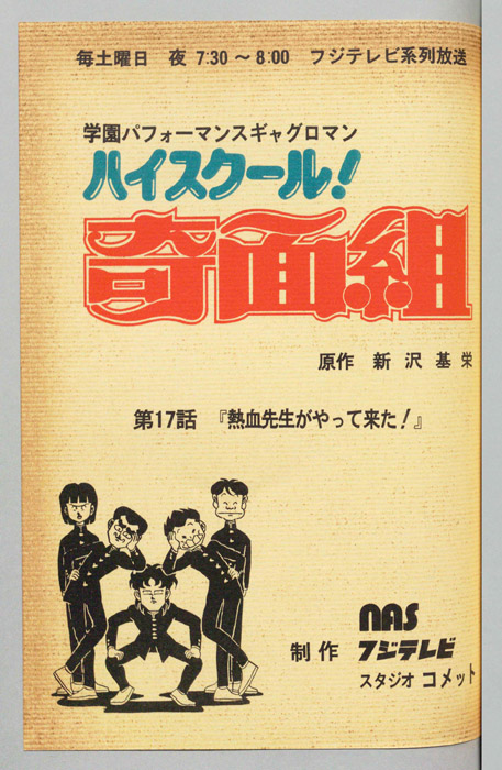 主な出演 : (一堂零)千葉繫,(冷越豪)玄田哲章,(大間仁)龍田直樹,(出瀬潔)二又一成,(物星大)塩沢兼人,(河川唯)高橋美紀,(宇留千絵)松井菜桜子,(寒然寺藍),(雲童塊)堀内賢雄,(亜切須腱)伊沢弘,(今條豊)塩屋浩三,(印田灰進)大『ハイスクール!奇面組』平凡な学校生活を送っていた女子中学生『河川唯(かわ ゆい)』と『宇留千絵(うる ちえ)』は、『奇面組』と呼ばれる悪名高い5人の男子学生と出会うことによって、退屈だった学生生活が一変する。奇面組のリーダー『一堂零(い