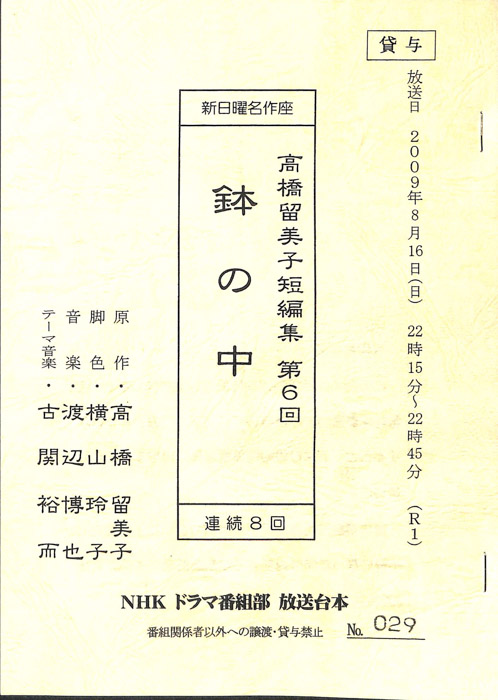 主な出演 : 小日向文世,片岡礼子,山田まりや,逢坂じゅん,吉永淳,押谷かおり,木内義一,ひろみどり,千草英子,興津正太郎,相川結,津波古太輝,田村ツトム,久野麻子,宮川サキ,寺下貞信,中川浩三,谷口知輝,渡辺知晃,今西彩,村上淳,杉本哲太,原田美枝子【高橋留美子劇場】本作は「高橋留美子劇場」を原作とする一話完結のテレビアニメである。アニメには二つのシリーズがあり、第一シリーズを「高橋留美子劇場」と称し、第二シリーズを「高橋留美子劇場・人魚の森」である。第一シリーズは日常の中に潜む、ち
