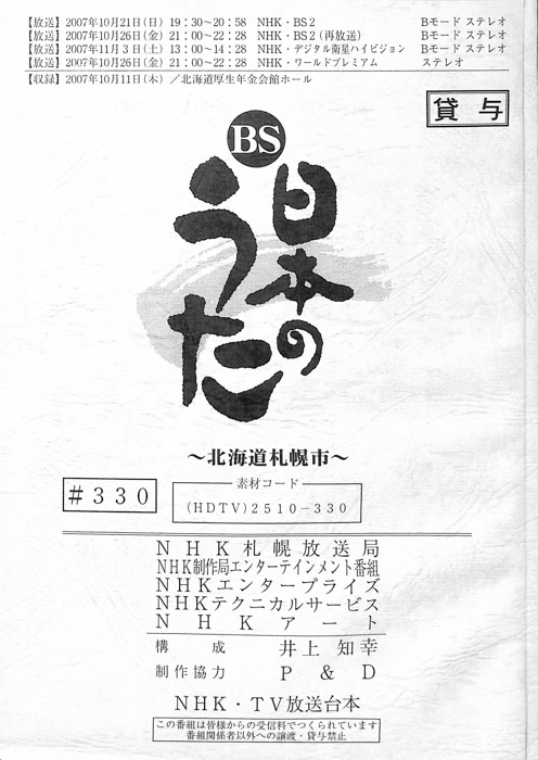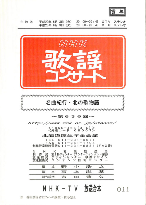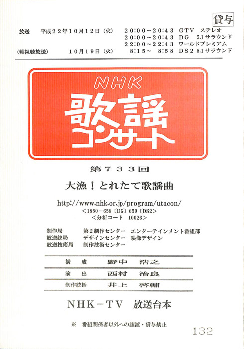 主な出演 : 綾小路きみまろ,橘大五郎,さかなクン,鳥羽一郎,中村美律子,山本智子,吉幾三,村岡弘之,藤榮史哉,玄也,菅由彩子,佐武宇綺,ツーライス- 作家 : 戸田山雅司