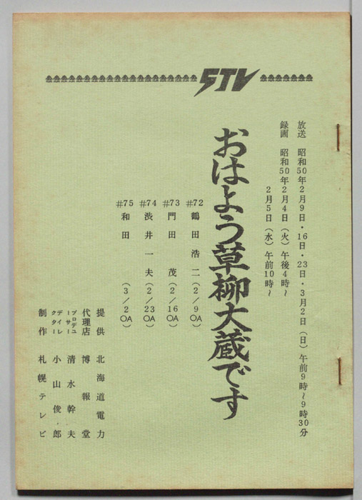 主な出演 : 部正子,沢アイ子,岩元るり子,池上小百合,井関富美子,牧弘子,(変な人達)藤崎郁三,二瓶十九也,山口滋,近藤昇,小野郁代,上野ルミ,(CM)阿里道子,(ゲスト)鶴田浩二,三遊亭円楽