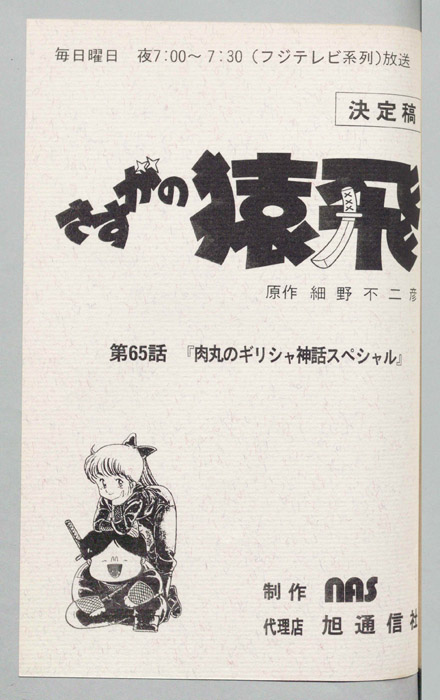 主な出演 : 星術師(猿飛八宝斉):八奈見乗児,アナウンサー(猿飛小源太):増岡弘,女子学生風ギャル(出門葉子):井上瑶,店長(出門虎造):寺田誠,店員(00893):千葉繫,店員(004898):間嶋里美]『さすがの猿飛』忍者を育成して現代社会に送り出す教育機関『私立忍ノ者高校』は、表向きは平凡な私立高校として経営されている。忍ノ者高校の創設者の孫『猿飛 肉丸』は背が低く、丸々と太っていて、一見すると忍者とは思えない姿なのだが、忍
