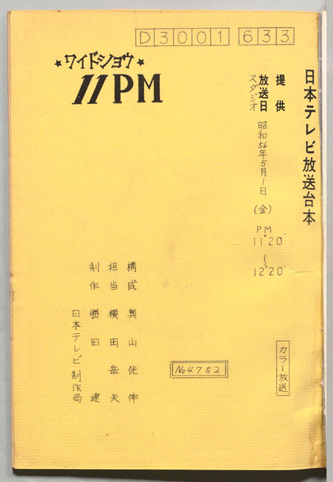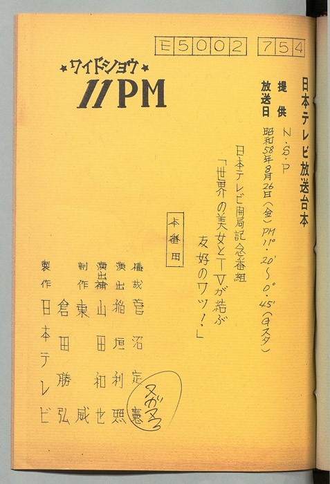 主な出演 : (ホスト)藤本義一,(ホステス)安藤孝子,(ニュース・キャスター)飯干晃一:大阪読売新聞記者,(イレブン・ドクター)木崎国嘉:大阪日赤内科部長,(バーテンダー)野村頻紹,(カバー・ガール)松岡由賀,(ハモンド)小曽根実,(プレゼント嬢)弥