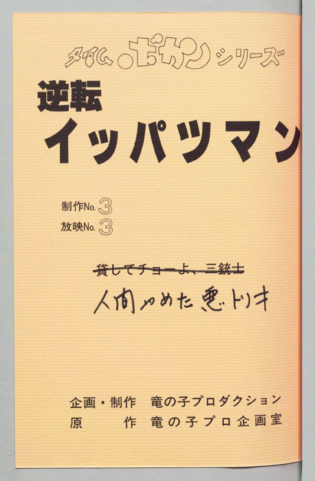 主な出演 : [豪速九(イッパツマン):富山敬,放夢ラン:原えりこ,ハル坊:つかせのりこ,2-3:山本正之,ムンムン:小原乃梨子,コストネン:八奈見乗児,キョカンチン:たてかべ和也,コン・コルドー:肝付兼太,ピーコ:横尾まり,セーコ:青木和代,隠ストアンデル北部支社の重役三人にタイム運搬の妨害を命じる。 タイムリース社でメカの整備を担当している「豪 速九」は超能力の素質を持っており、シャレコーベリース社の重役三人が変身したクリーン悪トリオが妨害に現れピンチになった時にイッパツマンとなって駆けつける。 イ