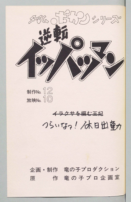主な出演 : [豪速九(イッパツマン),ささやきレポーター:富山敬,放夢ラン:原えりこ,ハル坊:つかせのりこ,2-3:山本正之,ヒゲノ部長:長堀芳夫,星ハルカ:幸田直子,ムンムン:小原乃梨子,コストネン:八奈見乗児,キョカンチン:たストアンデル北部支社の重役三人にタイム運搬の妨害を命じる。 タイムリース社でメカの整備を担当している「豪 速九」は超能力の素質を持っており、シャレコーベリース社の重役三人が変身したクリーン悪トリオが妨害に現れピンチになった時にイッパツマンとなって駆けつける。 イ
