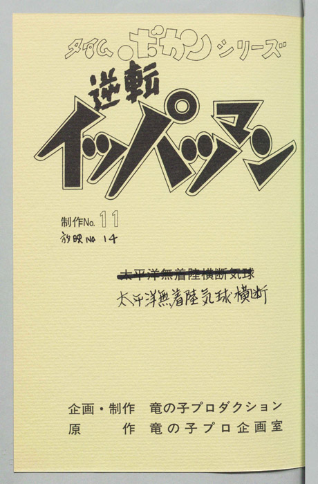 主な出演 : [豪速九(イッパツマン):富山敬,放夢ラン:原えりこ,ハル坊:つかせのりこ,2-3:山本正之,ヒゲノ部長:長堀芳夫,星ハルカ:幸田直子,ムンムン:小原乃梨子,コストネン:八奈見乗児,キョカンチン:たてかべ和也,コン・コルドー:肝付兼太,ミストアンデル北部支社の重役三人にタイム運搬の妨害を命じる。 タイムリース社でメカの整備を担当している「豪 速九」は超能力の素質を持っており、シャレコーベリース社の重役三人が変身したクリーン悪トリオが妨害に現れピンチになった時にイッパツマンとなって駆けつける。 イ